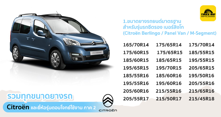 1.ขนาดยางรถยนต์มาตรฐาน สำหรับรุ่นรถ ซีตรอง เบอร์ลิงโก (Citroën Berlingo / Panel Van / M-Segment)