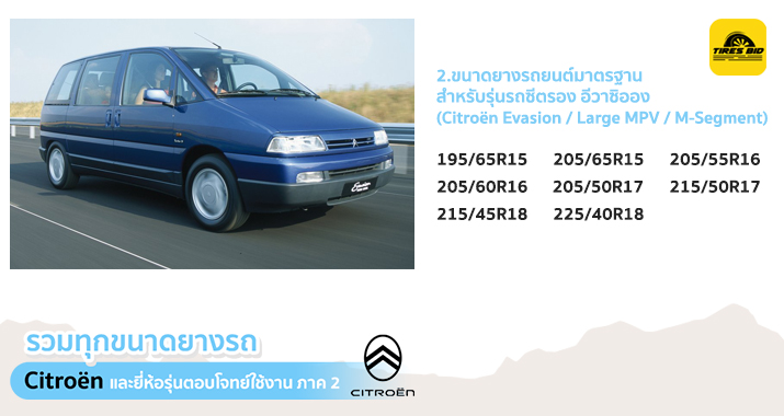 2.ขนาดยางรถยนต์มาตรฐาน สำหรับรุ่นรถ ซีตรอง อีวาซิออง (Citroën Evasion / Large MPV / M-Segment)