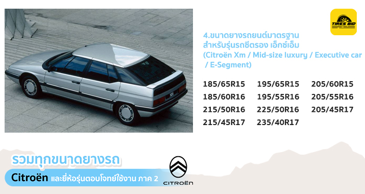 4.ขนาดยางรถยนต์มาตรฐาน สำหรับรุ่นรถ ซีตรอง เอ็กซ์เอ็ม (Citroën Xm / Mid-size luxury / Executive car / E-Segment)