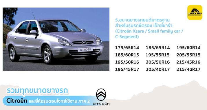 5.ขนาดยางรถยนต์มาตรฐาน สำหรับรุ่นรถ ซีตรอง เอ็กซ์ซาร่า (Citroën Xsara / Small family car / C-Segment)