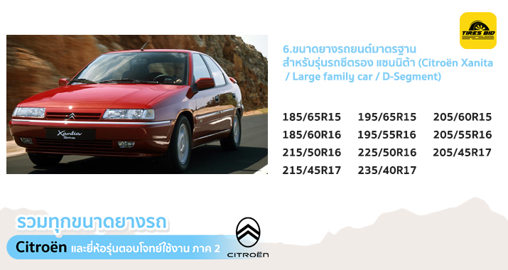 6.ขนาดยางรถยนต์มาตรฐาน สำหรับรุ่นรถ ซีตรอง แซนนิต้า (Citroën Xanita / Large family car / D-Segment)