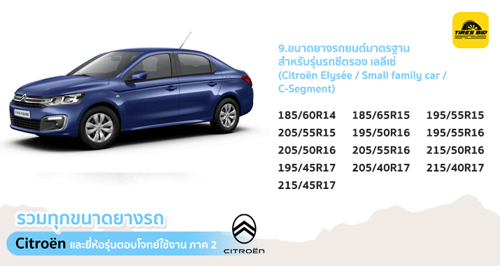 9.ขนาดยางรถยนต์มาตรฐาน สำหรับรุ่นรถ ซีตรอง เลลีเซ่ (Citroën Elysée / Small family car / C-Segment)