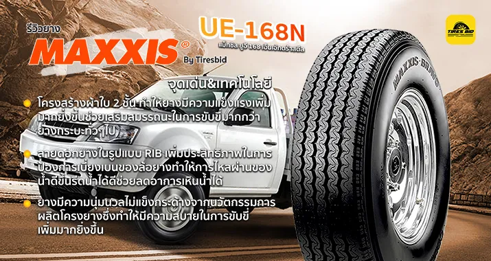 ยาง Maxxis UE-168 N จะมีผลิตเฉพาะไซส์ 215/75R16 ซึ่งเป็นยางสำหรับรถ TATA และรถตู้บางรุ่นเท่านั่นซึ่งถือว่าเป็นยางที่ค่อนข้างอเนกประสงค์ในการใช้งานเหมาะสำหรับรถกระบะที่ใช้ขนสินค้าที่มีน้ำหนักไม่เกิน 2 ตันครับ แต่ยางไม่ค่อยนุ่มเงียบเท่าไหร่ แต่ความคุ้มค่าของราคายางค่อนข้างคุ้มเพราะถือว่าเป็นยางราคาประหยัด แต่การใช้งานไม่มีปัญหา โดยภาพรวมให้อยู่ที่ 3 คะแนนครับ